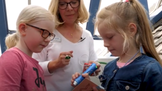 Im Video ist eine Kindergruppe zu sehen, die bei Birgitt Mager in der Stadtbücherei Nettetal zu Besuch ist, um dort bei einer spanennden Rallye mit dem Audiostift die Bibliothek, deren Räumlichkeiten und vielfältigen Medien kennenzulernen.